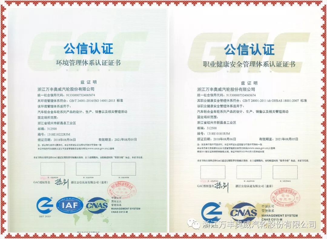 近日,浙江公信认证有限公司公信认证专家莅临万丰奥威汽轮,进行安环体系再认证审核,最终,依据GB/T24001-2016及GB/T28001-2011,